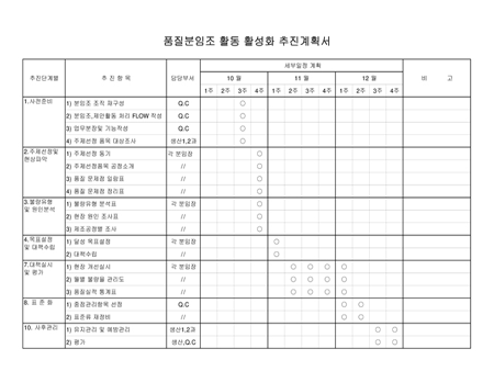 추진단계별,추진항목,담당부서,세부일정계획을 기록하는 품빌분임조 활동 활성화 추진계획서입니다.