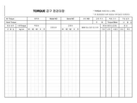 TORQUE 공구 점검대장양식으로 사용Torque에 따른 측정치, 교정이유, 교정치, 불출.반납일자 및 이유, 현재사용장소등의 항목으로 구성되어 있습니다.