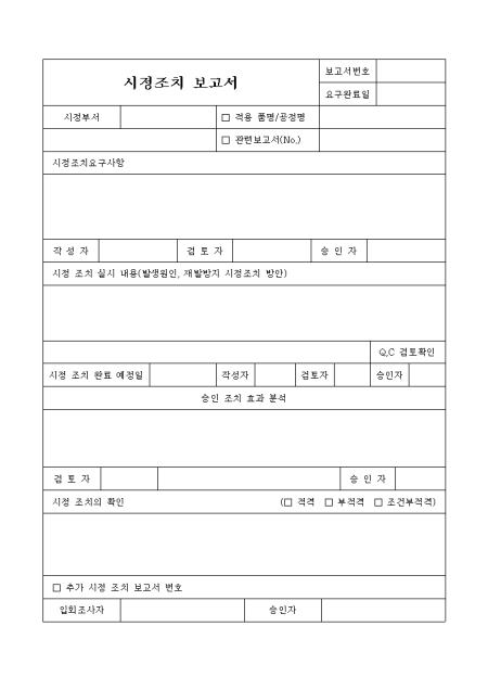 시정조치 요구양식으로 시정조치 요구사항과 시정조치실시내용, 효과분석등의 항목을 기재합니다.