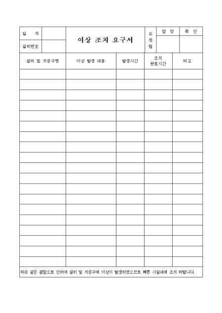 결함으로 인하여 설비 및 치공구에 이상이 발생하였으므로 빠른 시일내에 조치 해 줄것을 요청할 때 사용하는 양식입니다.