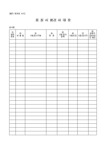 서험 검사구분, 재료, 시험 검사항목, 시험성과등의 항목으로 구성되어 있는 품질시험, 검사대장 양식입니다.
