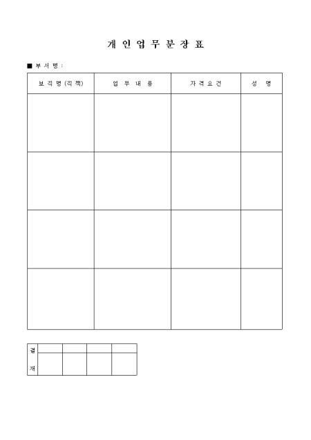 보직명,업무내용,자격요건등을 기록하면 결재란이 있는 개인업무분장표입니다.