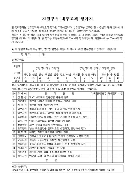 팀 업적평가를 위해 내부 부서 평가를 할 수 있는 양식입니다. 평가항목으로는 전문성,사전예측,공정성,업무개선,업무지원 등 총 16항목으로 되어 있습니다.