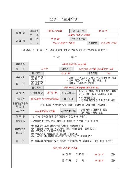사용자와 근로자간에 근로계약을 체결할 때 사용하는 표준근로계약서입니다. 근로장소와 직종, 임금구성 등의 항목으로 상세하게 구성되어 기재할 수 있도록 작성되어 있습니다.