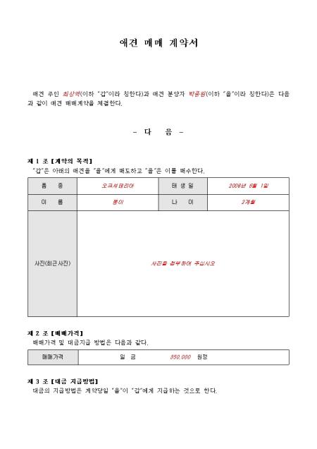 애견주인과 애견분양자간에 애견매매계약을 체결할 때 사용할 수 있는 애견 매매 계약서입니다. 6개의 계약조항으로 구성되어 있으며 애견의 사진을 첨부할 수 있습니다.