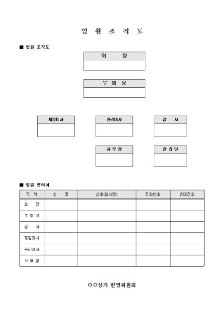 상가 번영위원회 임원조직도입니다. 임원구성도와 임원연락처를 작성할 수 있도록 제작되어 있습니다.