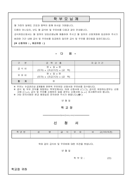 급식비와 우유비에 대한 학부모님들께 보내는 가정통신문입니다. 간단한 신청서양식과 함께 샘플이 포함되어 있습니다.