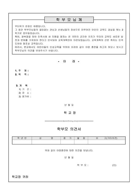 어린이드의 인성교육을 위하여 야영훈련을 하고자 할때 학부모님들께 보내는 가정통신문입니다. 간단한 학부모 의견서 양식과 함께 샘플을 포함하고 있습니다.