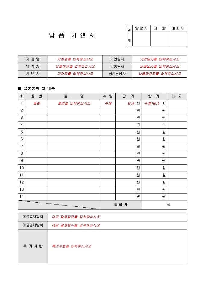 9,000원/월기획부에서 납품에 대한 기안을 작성할 때 사용하는 서식입니다. 납품품목 및 내용을 상세하게 작성하여 결재를 받을 수 있습니다.