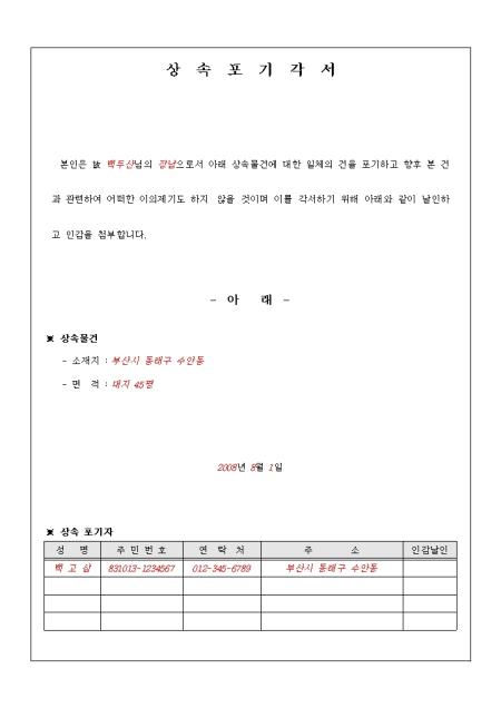 상속물건에 대하여 일체의 건을 포기하고 본건에 관련하여 이의제기를 하지 않는다는 내용의 상속 포기각서입니다. 상속 물건에 대한 표시 및 상속 포기자의 인적사항을 작성한 후 날인하고 인감을 첨부하여 각서를 작성할 수 있습니다. 간단한 샘플을 포함하고 있습니다.