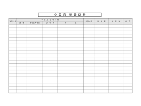 수료증 발급에 대한 사항을 작성할 수 있는 발급대장 서식입니다. 수료자의 인적사항 및 발급번호, 합격번호 등을 작성할 수 있습니다. 간단한 샘플을 포함하고 있습니다.