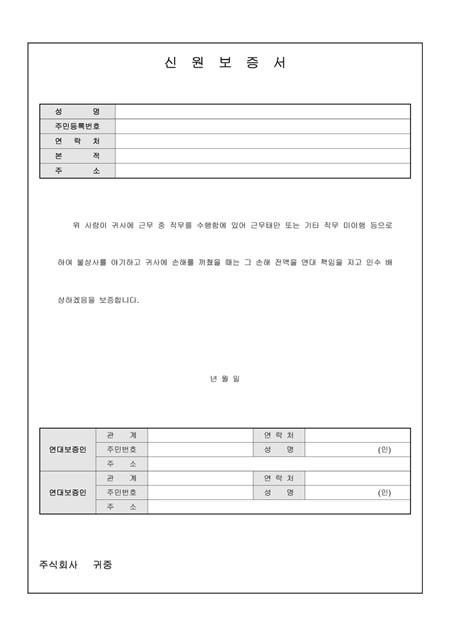 입사 구비서류 중 하나인 신원보증서입니다. 근무중 수행함에 있어 직무 미이행으로 귀사에 손해를 끼쳤을 때 연대책임을 지고 배상한다는 내용으로 작성되어 있으며 입사지원자 및 연대보증인의 인적사항을 작성할 수 있습니다. 간단한 샘플을 포함하고 있습니다.