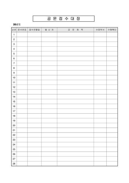 연도별로 공문의 수발에 대하여 작성하여 보관할 수 있는 수발대장입니다. 문서번호, 접수연워일, 발신처, 공문제목 등을 자세하게 작성할 수 있습니다. 간단한 샘플이 포함되어 있습니다.