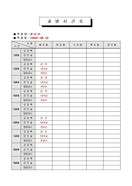 과별 시간표를 작성하여 사용할 수 있는 시간표 서식입니다. 요일 및 시간별로 교과목, 강의실, 담당교수를 작성하여 사용할 수 있습니다. 간단한 샘플이 포함되어 있습니다.