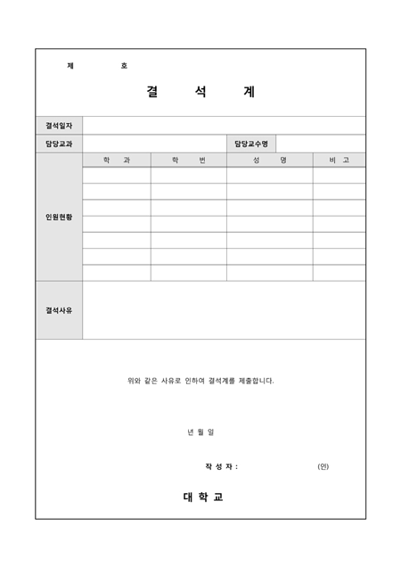 단체로 결석계를 제출할 때 사용하는 서식입니다. 결석일자 및 담당교과 교수에게 제출하며 결석 인원현황 및 결석사유를 작성하여 제출할수있습니다.
