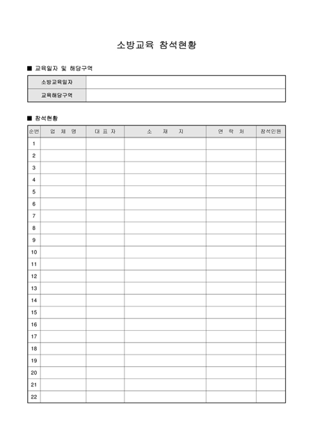 업체별 소방교육 참석현황에 대하여 작성할 수 있는 서식입니다. 교육일자 및 해당구역과 참석현황을 작성할 수 있습니다. 간단한 샘플이 포함되어 있습니다.