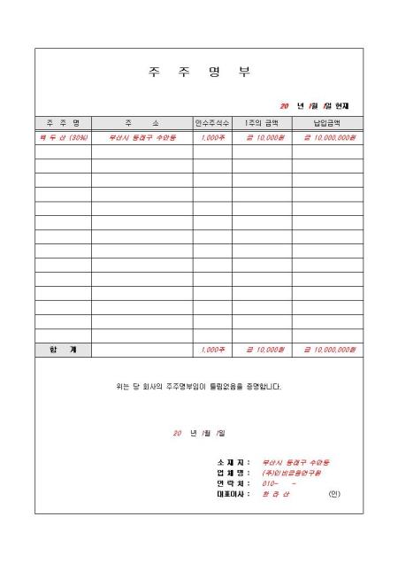 당 회사의 주주명부임이 틀림없음을 증명할 때 사용하는 서식입니다. 주주명, 주주의 주소, 인수주식수, 1주의 금액, 납입금액 등을 작성할 수 있습니다. 간단한 샘플이 포함되어 있습니다.