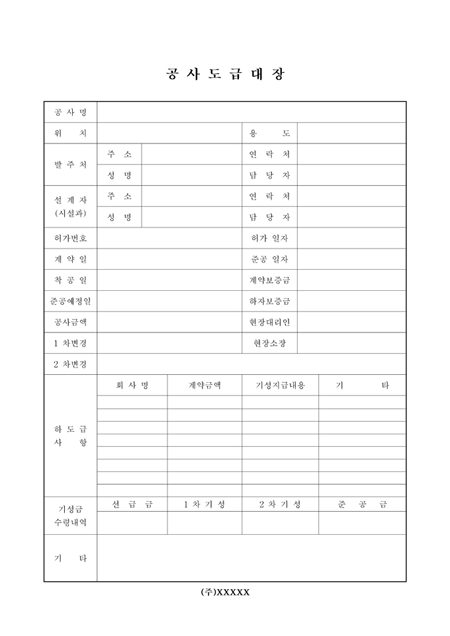 공사명,발주처 및 설계자 인적사항,공사계약일,착공일,하도급 사항등을 기록하는 양식입니다.