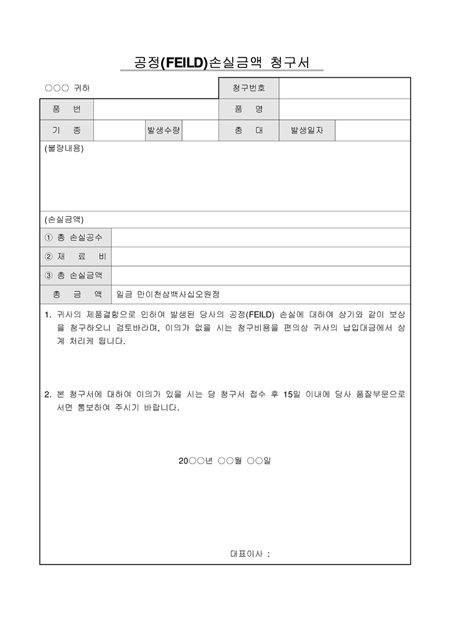 제품결함으로 인해 발생된 손실에 대해서 보상을 청구하는 양식입니다. 불량내용과 손실금액을 기재합니다.