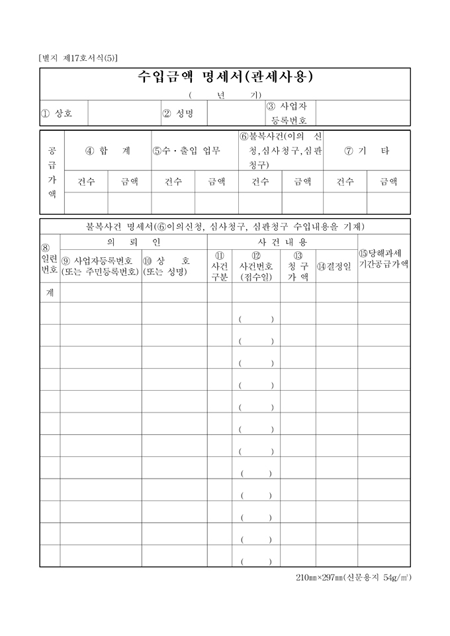 상호,성명,공급가액,불복사건 명세서의 이의신청,심사청구,심판청구 수입내용을 기재하는 양식입니다.