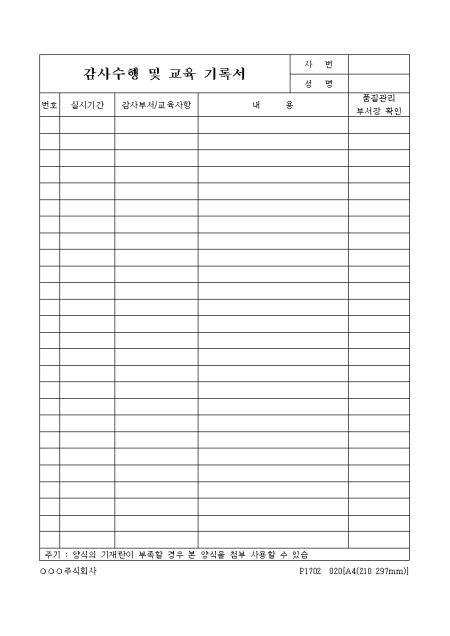 실시시간,감사부서,감사수행 및 교육 내용,품질관리자 확인을 기재하는 양식입니다.