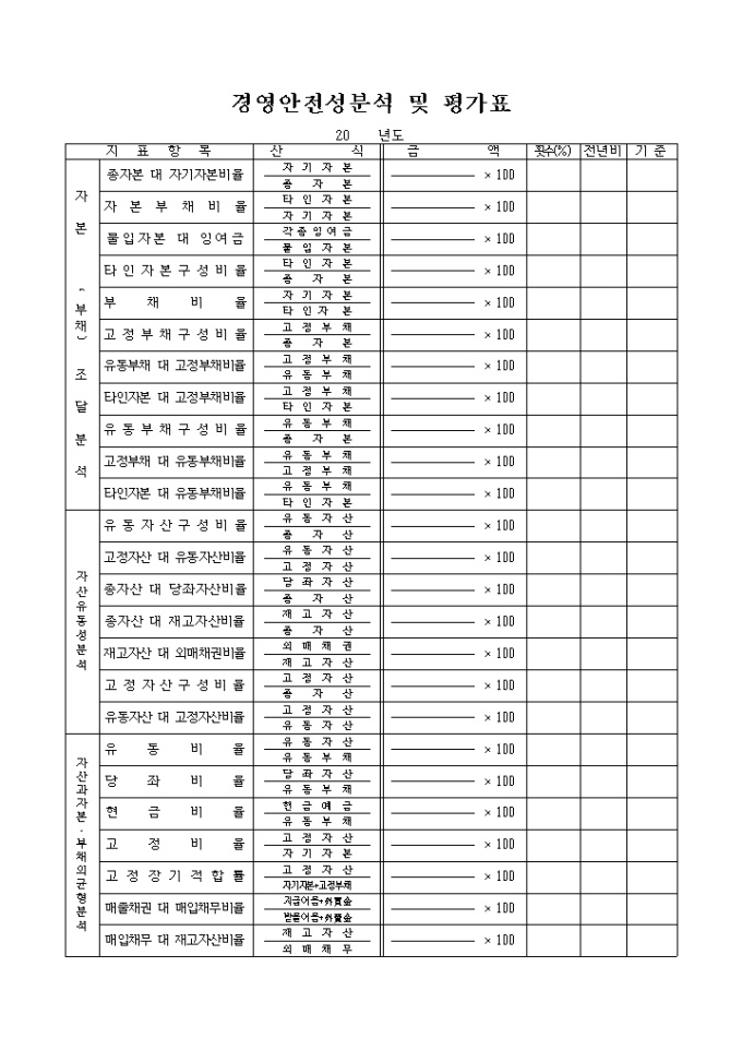 9,000원/월자본(부채)조달분석,자산유동성분석,자산과자본 및 부채의 균형분석을 기록하는 경영안전성분석 및 평가표입니다.