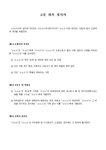“을”은 “갑”에게 고문으로서 '을'의 세무.회계.경리업무의 수행을 위촉하며 “갑”은 승낙한다는 내용의 고문 위촉 계약서입니다.