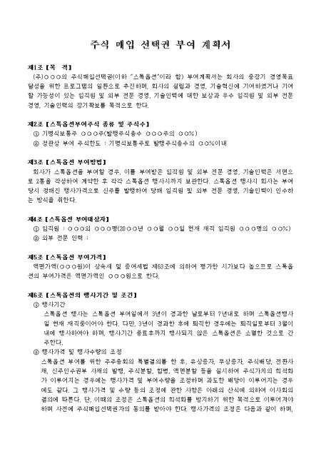 아래의 항목으로 이루어진 주식매입선택권 부여 계획서입니다. 1.목적 2.스톡옵션부여주식 종류 및 주식수 3.스톡옵션 부여방법 4.스톡옵션 부여대상자 5.스톡옵션 부여가격 6.스톡옵션의 행사기간 및 조건 7.권리의 변경 등..
