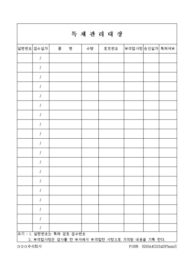 9,000원/월접수일자별 품명,수량,로트번호,부적합사항,승인일자,특채여부를 기록하는 특채관리대장입니다.