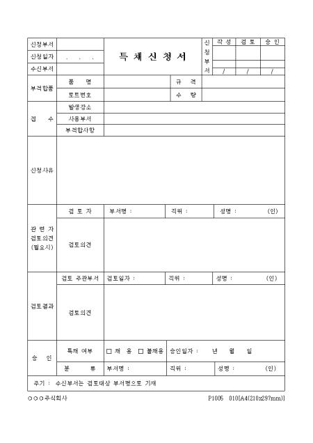 신청사유,관련자 검토의견,검토결과,승인여부를 기록하는 특채신청서입니다.