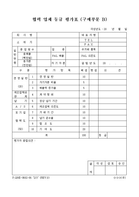 구매부분을 평가하는 협력업체 등급평가표입니다. 아래의 항목을 평가합니다. 1.경영일반 2.제조업체와 관계 3.납기 4.A/S 5.모기업협력도