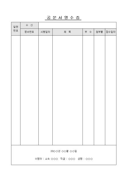 문서번호,시행일자,제목,부수,첨부물,접수일자를 기록하는 공문서영수증입니다.