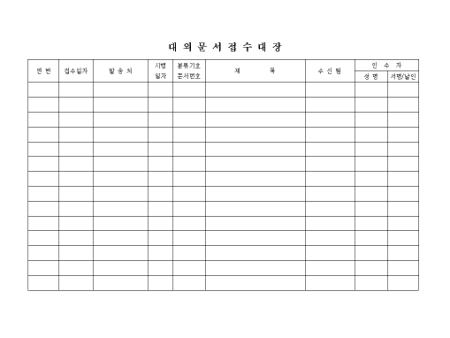 접수일자,발송처,시행일자,분류기호,제목,수신팀을 기록하는 대외문서접수대장입니다.