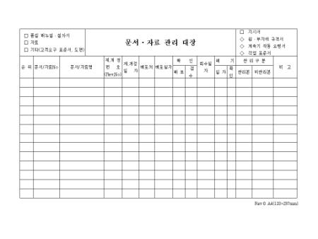 문서번호,문서자료명,제개정번호,일자,배포처,배포일자,회수일자 등으로 구성된 문서,자료 관리대장입니다.