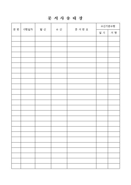 연번,시행일자,발신,수신,문서번호,수신기관수령을 기록하는 문서사송대장입니다.