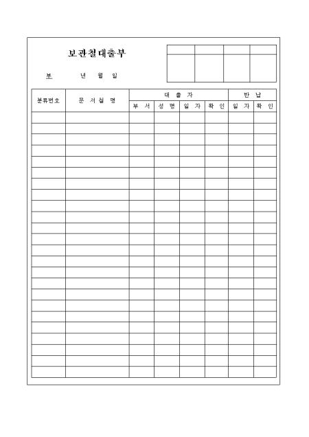분류번호,문서철명,대출자 부서,성명,일자와 반납일을 기록하는 보관철대출부입니다.