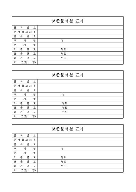 분류번호,문서철의 제목,문서번호,부서명,문서명,이관연도,보존연도,폐기연도를 기록하는 양식입니다.
