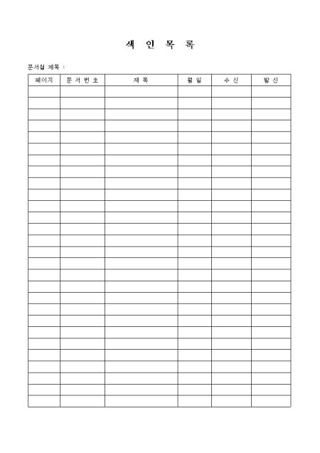 페이지,문서번호,제목,월일,수신,발신을 기록하는 색인목록표입니다.