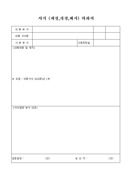 의뢰부서,의뢰서식명,사용부서,의뢰내용 및 취지를 기록하는 서식(제저,개정,폐지)의뢰서입니다.