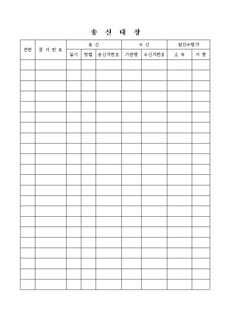 문서번호,송신 일시,방법,송신자번호와 수신 기관명,수신자번호,원안수령자 소속,서명을 기록하는 송신대장입니다.