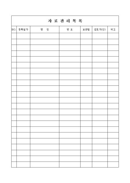 등록일자,명칭,번호,보관팀,검토자,비고란으로 구성된 자료관리목록표입니다.