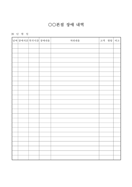 날짜,장애시간,복귀사간,장애내용,처리내용,고객현황을 기록하는 장애내역서입니다.