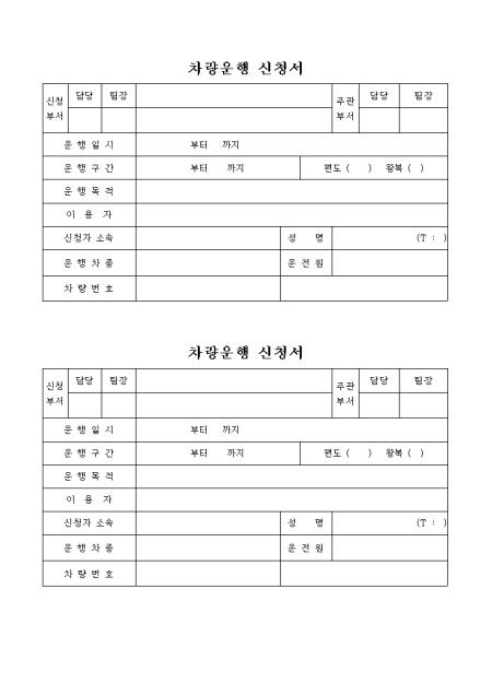 운행일시,운행구간,운행목적,이용자,운행차종,차량번호를 기재하는 차량운행 신청서입니다.