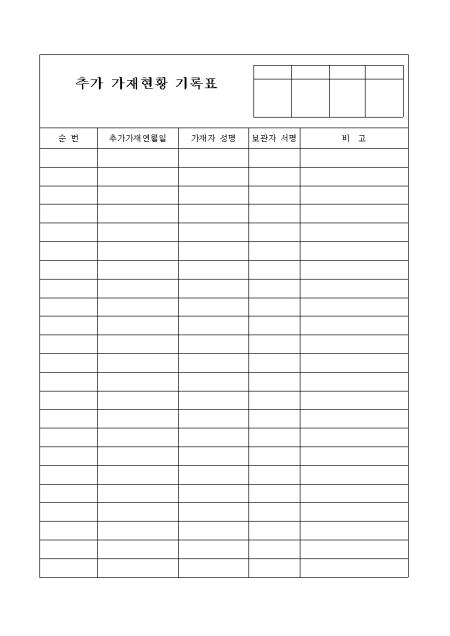 순번,추가가재연월일,가재자 성명,보관자 서명,비고로 구성된 추가 가재현황 기록표입니다.