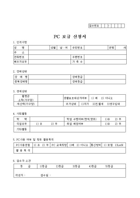 인적사항,장애상태,경제상태,사회활동,PC사용 여부 및 향후 활용목적,접수자 소견을 기록하는 PC보급신청서입니다.