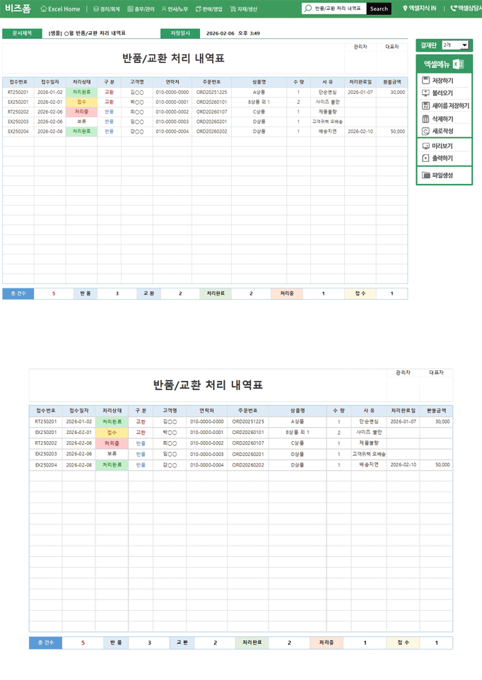 반품/교환 처리 내역표