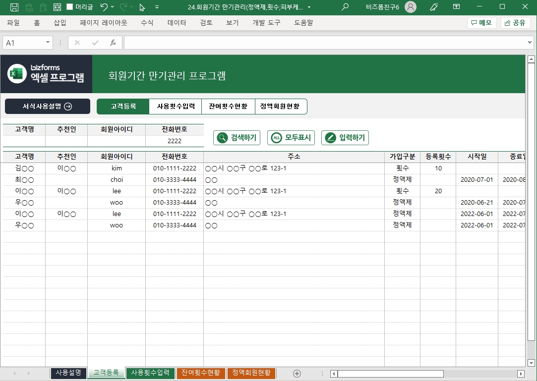 회원기간 만기관리 프로그램(고객등록, 사용횟수등록, 잔여횟수현황, 정액회원..