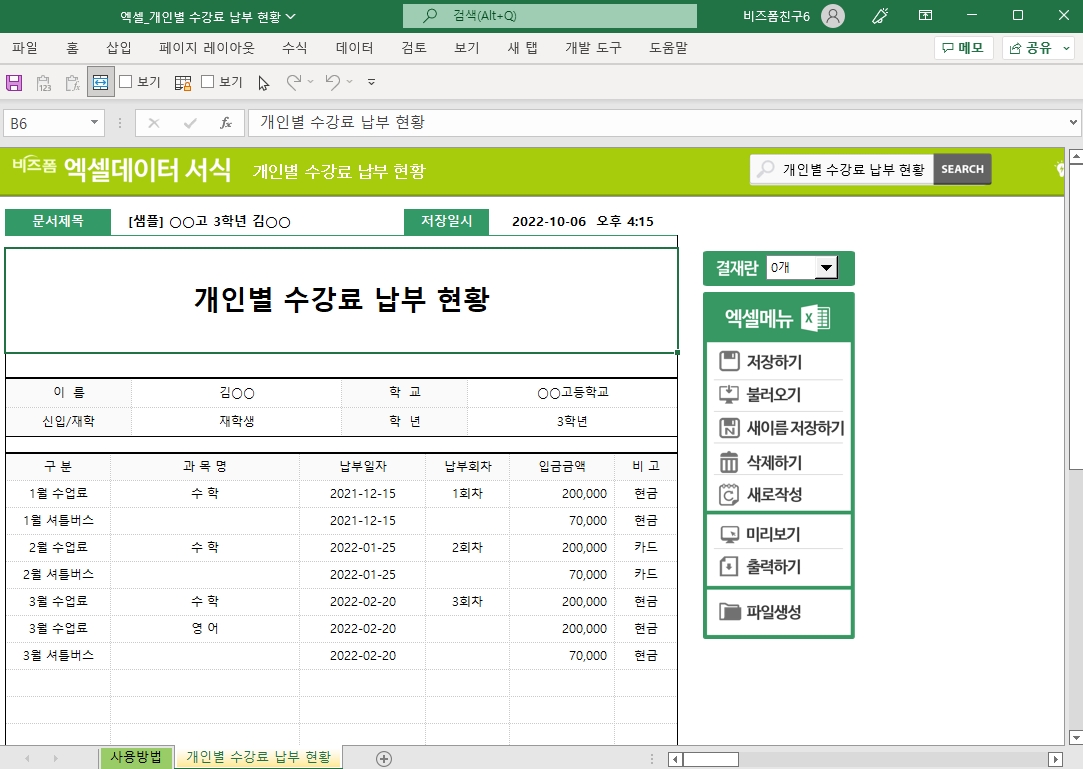 개인별 수강료 납부 현황