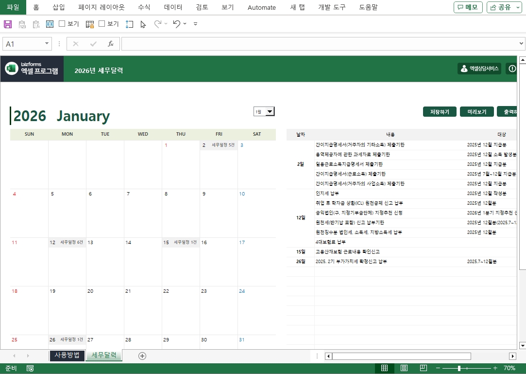 2026년 엑셀자동달력(스케줄관리,일정관리)
