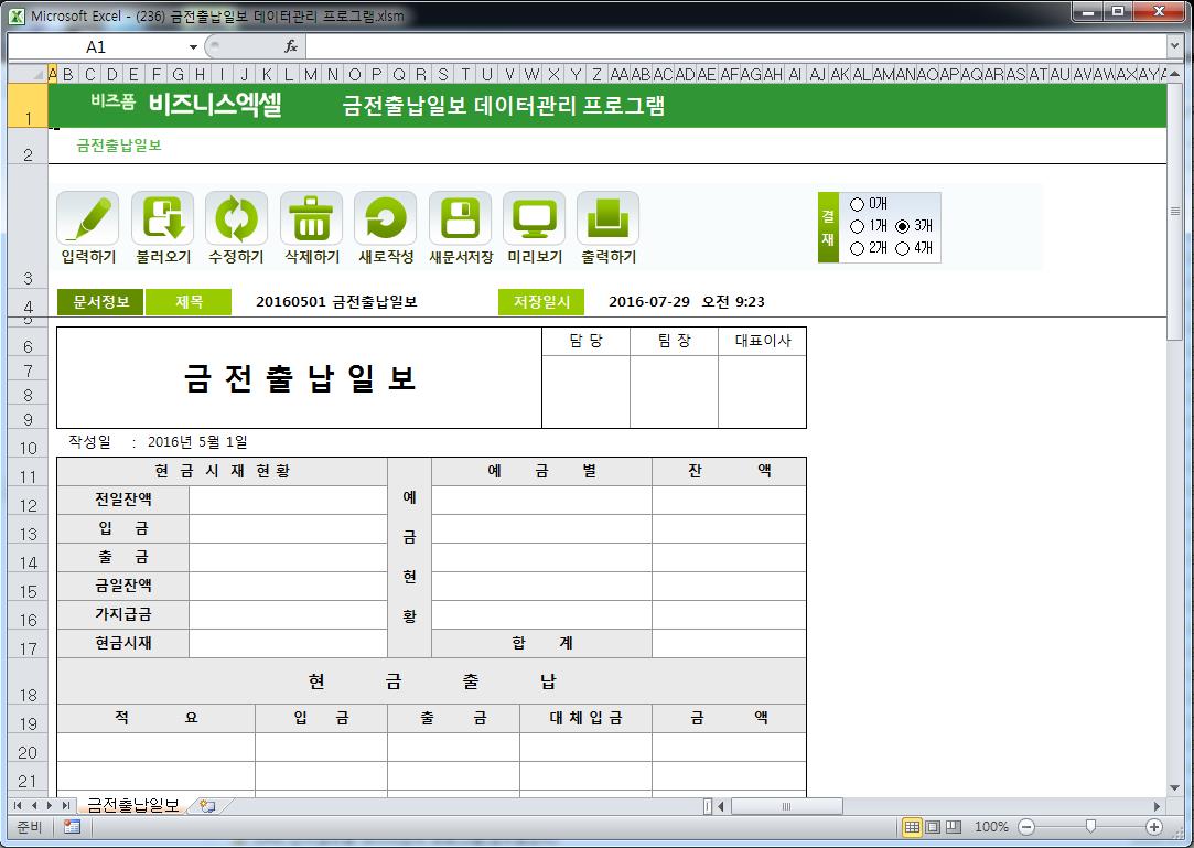 현금출납부 업무자동화 프로그램(일자별관리, 월별통계)